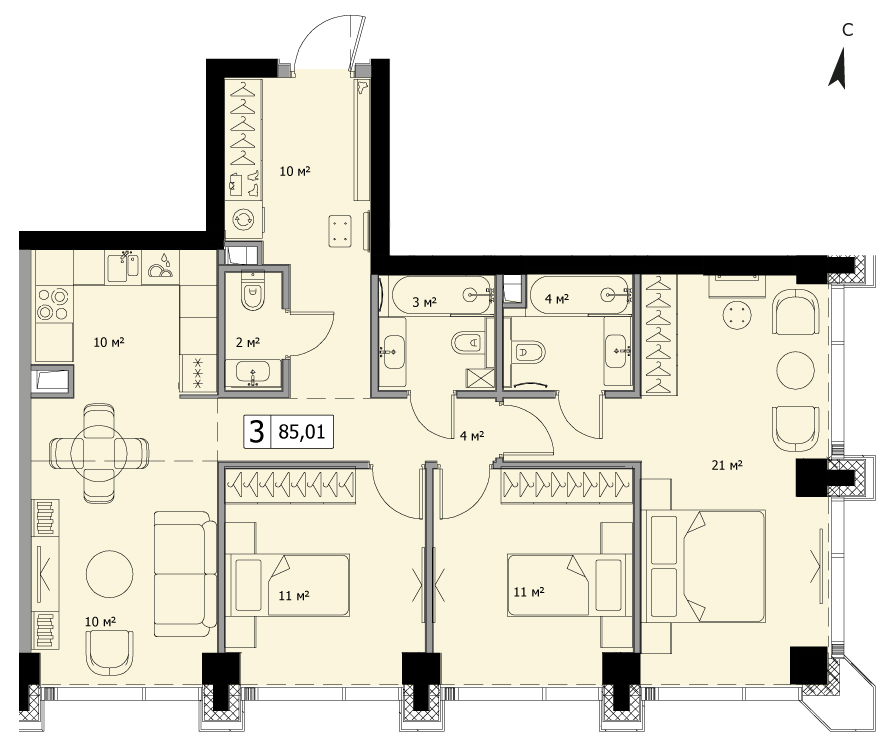 3-комн. кв., 85.71 м², 34/55 этаж