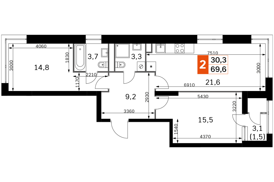 2-комн. кв., от 41.8 м², 13/28 этаж