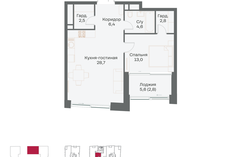 1-комн. кв., от 31.5 м², 2-35 этажи