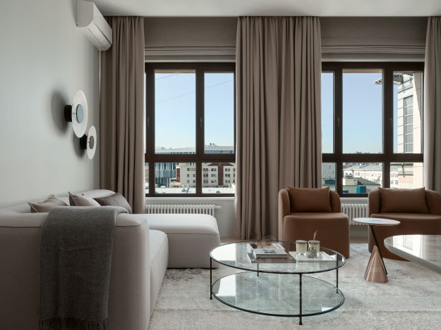 Планировка: просторная гостиная, уютный рабочий кабинет, полноценная master-зона с собственной спальней, ванной и гардеробной, вторая спальня, гостевой санузел, отдельная гардеробная комната и постирочная.