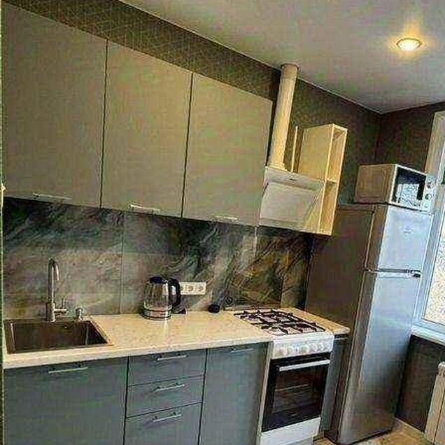 Кухонный гарнитур с газовой плитой с электроподжигом конфорок, холодильник, микроволновая печь, эл. чайник, новая стиральная машинка.