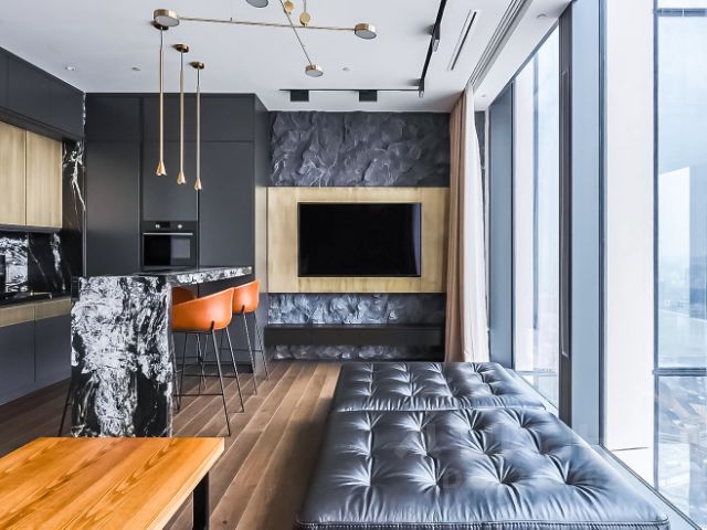 Панорамное остекление открывает захватывающие виды на столицу, наполняя пространство естественным светом и энергией.