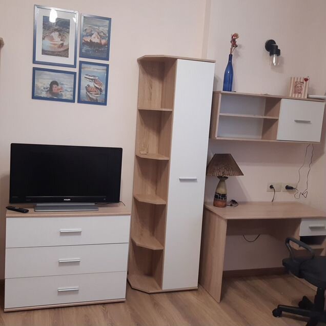 Просторный светлый зал оборудован большим гардеробом, качественным раскладным диваном, телевизором и шторами блекаут. В детской установлен раскладной диван, гардероб, стол и открытые полки. Кухня выходит на просторный балкон со стеллажами. Раздельные туалет и ванная оснащены всем необходимым. В коридоре установлен большой гардероб с высокими зеркалами. Также в квартире есть кладовая со стеллажами. Квартира укомплектована пылесосом, утюгом и доской, чайником и микроволновой печью.