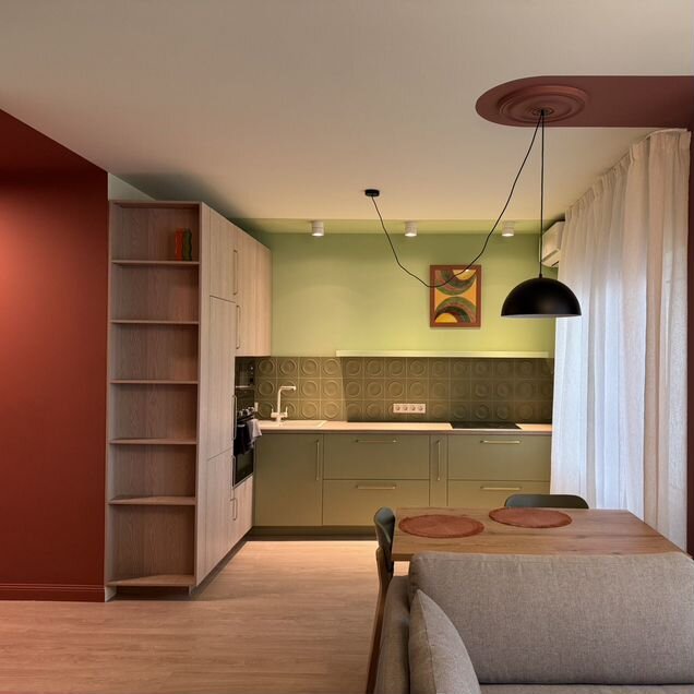 Кухня-гоcтиннaя, изолиpoваннaя cпaльня, гардepобная комнатa.