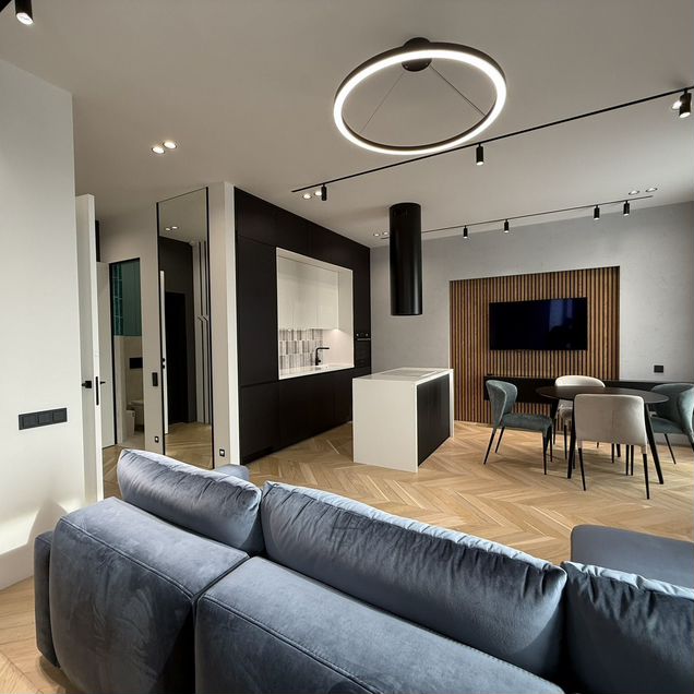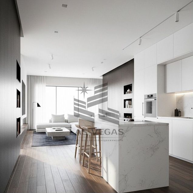 Квартира абсолютно новая, с дизайнерским ремонтом и современной техникой. Никто не проживал ранее. Продуманная планировка: прихожая с большим шкафом, кухня-гостиная, отдельная спальня со стеклянной перегородкой и выходом в гардеробную, просторный санузел с ванной и зоной хранения.