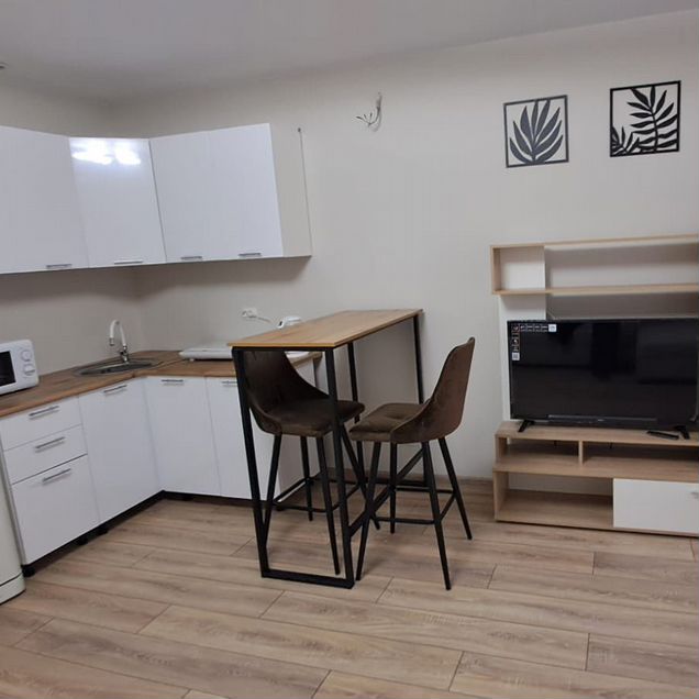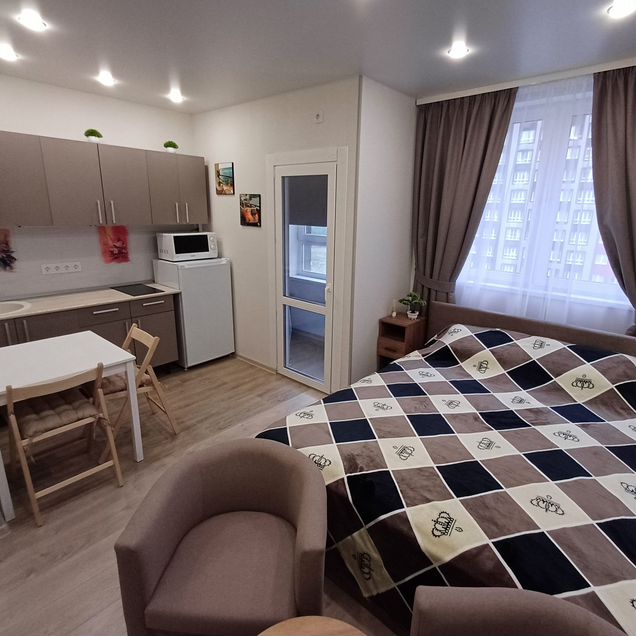 В квартире выполнен качественный евроремонт. Пространство студии продумано до мелочей, чтобы вы могли чувствовать себя комфортно и уютно. На кухне и в комнате есть вся необходимая мебель. Для вашего удобства установлены холодильник и стиральная машина. Ванная комната оснащена полноценной ванной, что особенно приятно после рабочего дня.