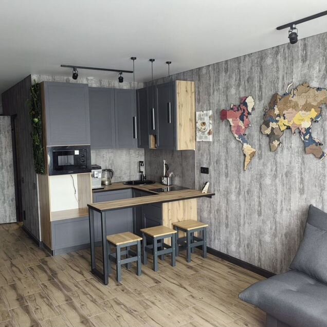 Из общего только постирочная зона на первом этаже - она общего пользования, кухонная зона и сан.узел непосредственно в апартаментах.