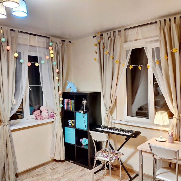На некоторых фото в комнате временная лампа. На последнем современная, она сейчас и установлена.