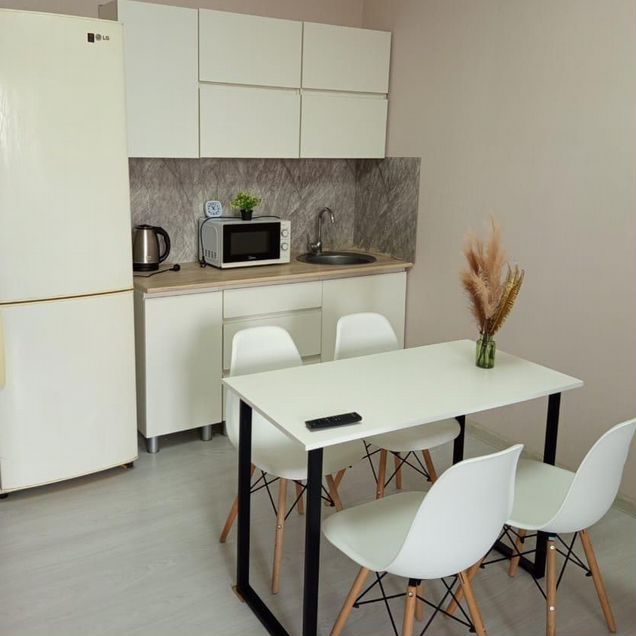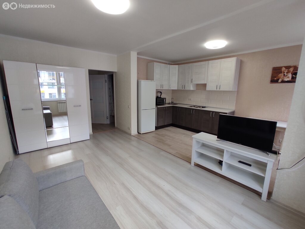 В квартире выполнен дизайнерский ремонт, который придаёт интерьеру современный и уютный вид. Здесь есть все необходимое для комфортного проживания: на кухне и в комнате — мебель, техника представлена холодильником и стиральной машиной. Планировка студии удобная и функциональная, а наличие просторной лоджии позволяет наслаждаться видами на окрестности. Санузел совмещенный и оборудован ванной.