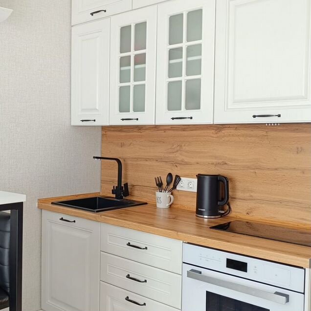 Вместительная кухня с вытяжкой, индукционной варочной поверхностью, духовым шкафом с функцией Свч.