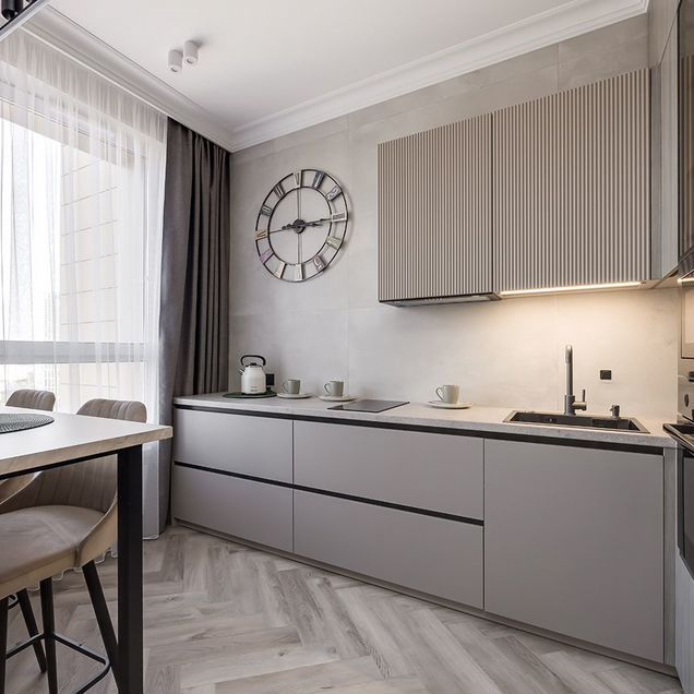 -Укомплектованная кухня: встраиваемая техника Siemens (посудомоечная машина, холодильник, микроволновка, духовка, варочная панель).