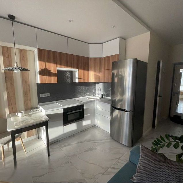 В квартире выполнен качественный дизайнерский ремонт. Удобная функциональная планировка (фактически Евро-2): кухня гостиная, зона спальни, прихожая, совмещенный санузел. Квартира укомплектована качественной мебелью и техникой. Сдается впервые, всё новое.
