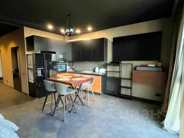 В кухне гостиной выполнено зонирование: кухонная зона, зона гостиной, обеденная зона. Укомплектована мебелью и техникой: угловой встроенный кухонный гарнитур с варочной панелью, вытяжкой, духовкой, микроволновой печью, встроенным холодильником с системой No-Frost. В наличии аэрогриль, чайник, посуда. Обеденный стол (барная стойка) с мягкими стульями. Диван, тумба по ТВ, телевизор. Установлен кондиционер.