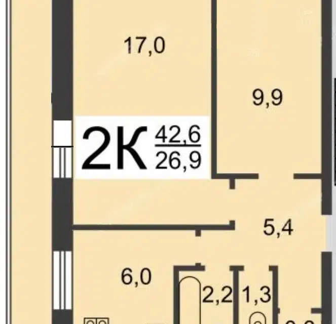 2-комн. кв., 42.6 м², 6/9 этаж