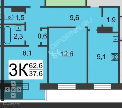 3-комн. кв., 62.6 м², 1/9 этаж
