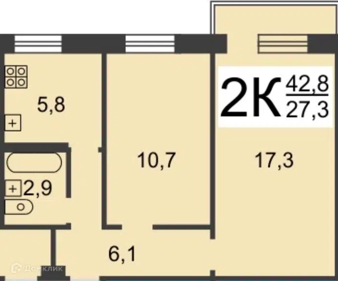 2-комн. кв., 42.8 м², 2/5 этаж