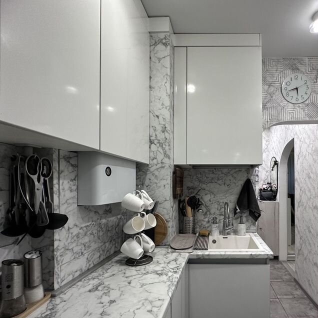 Жилая комната площадью 17 кв м с выходом на застеклённый балкон, удачно зонирована на пространство для отдыха и рабочую зону, просторная кухня 6,8 кв. М. (что удивительно для хрущёвок), совмещённый санузел в современной керамической плитке и квадратная прихожая комната.
