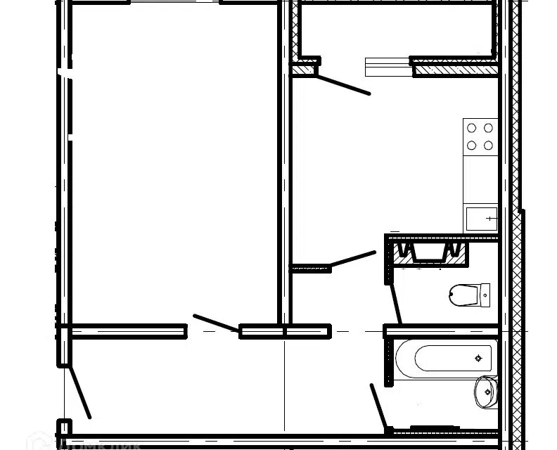 * Планировка: 19 м² разделена на две отдельные комнаты, еще одна комната 9,8 м², кухня 6 м².