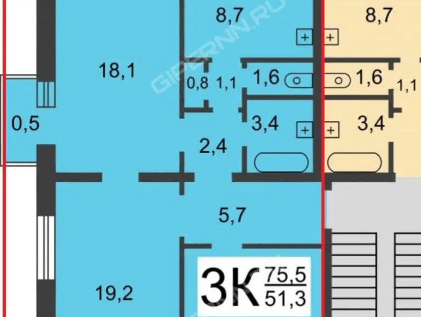 3-комн. кв., 75.5 м², 3/5 этаж