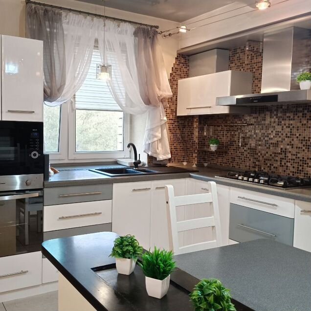 Кухня совмещена с гостиной комнатой, с грамотным зонированием. Кухонный гарнитур и вся встроенная в кухню техника: холодильник, морозильная камера, посудомоечная машина, микроволновая печь, варочная панель на 5 конфорок, духовой шкаф, вытяжка, входит в стоимость продажи.
