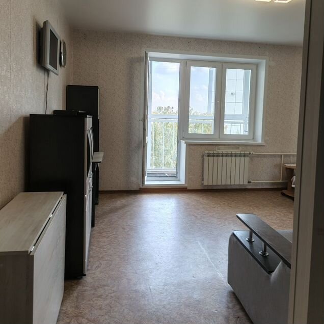 Студия свободной планировки с балконом длиной 5м, выход из кухни и окно из комнаты.