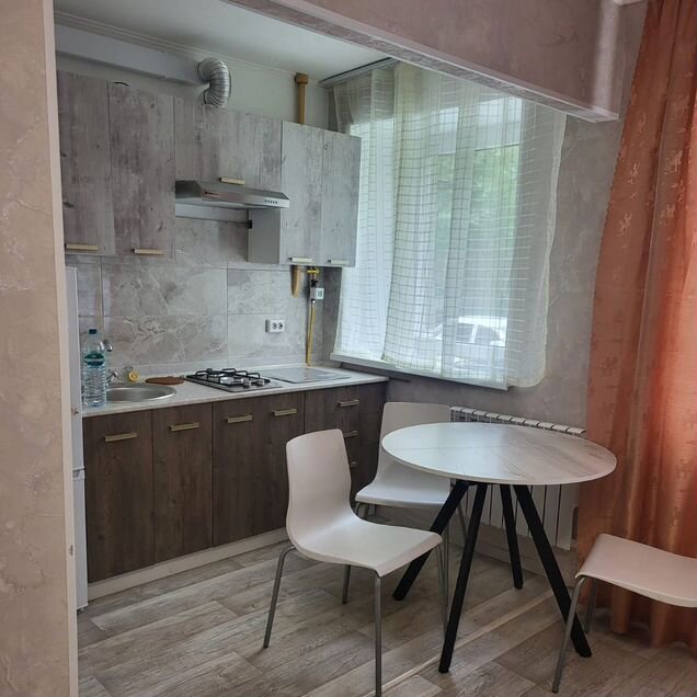 Квартира с мебелью . Кухня полностью оборудована: есть холодильник и мебель для приготовления и приёма пищи. Балкон с видом на улицу . Санузел совмещённый и выполнен в светлых тонах имеется стиральная машина.