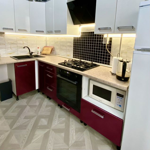Квартира полностью укомплектована всем необходимым для приятного проживания (огромный и вместительный шкаф-купе, кухонный гарнитур, индукц. плита, духовка, холодильник, стир. машина, телевизор, диван, микроволновая печь, чайник, утюг). Имеется застеклённый балкон.