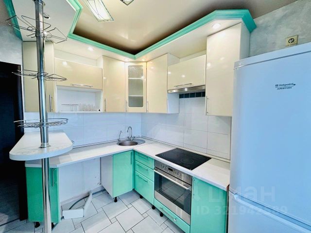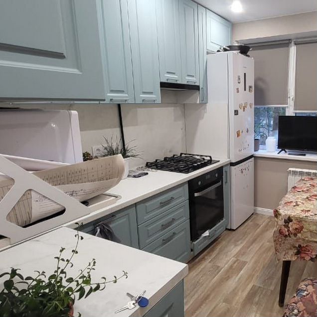 В квартире выполнен хороший косметический ремонт. Есть практически все необходимое для проживания: современный кухонный гарнитур со встроенной варочной панелью и духовым шкафом, холодильник, диван, кресло, шкафы и тумбы, телевизор.