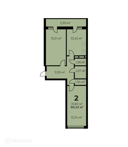 2-комн. кв., 51.6 м², 2/9 этаж