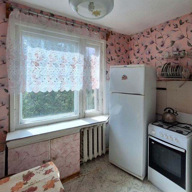 Кухня расположена с видом во двор, комнаты — вид на улицу. В квартире останется кухня, холодильник, стиральная машина, микроволновая печь.