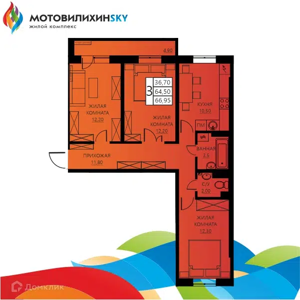 3-комн. кв., 66.8 м², 1/9 этаж