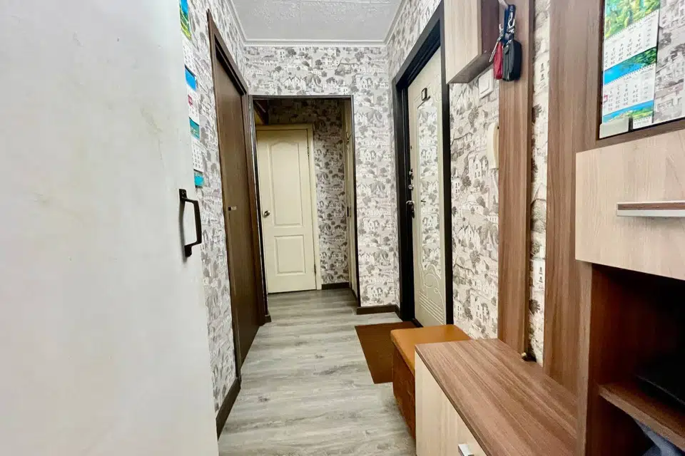 В квартире остается шкаф-купе в коридоре, кухонный гарнитур, водонагреватель.