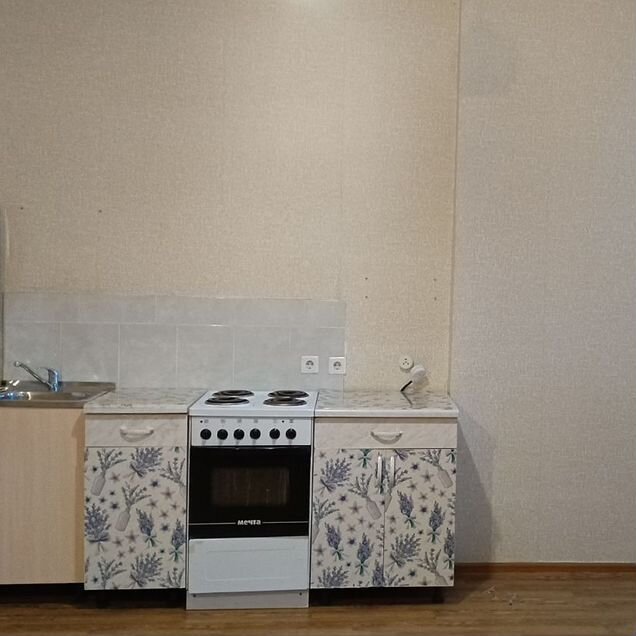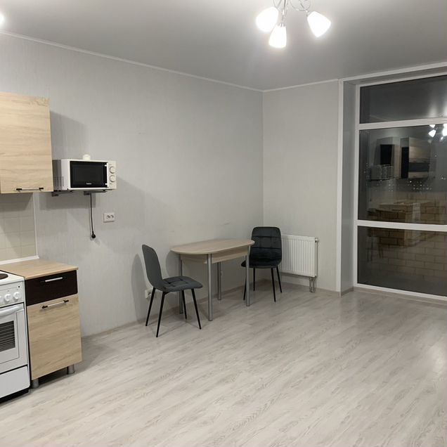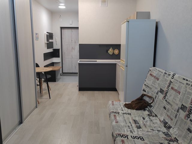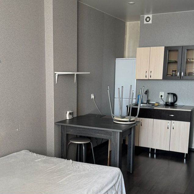 Квартира студия. В непосредственной близости магазины и автобусная остановка. В наличии шкаф-куппе, холодильник, кухня, электрическая варочная панель, стол, тумба под ТВ.