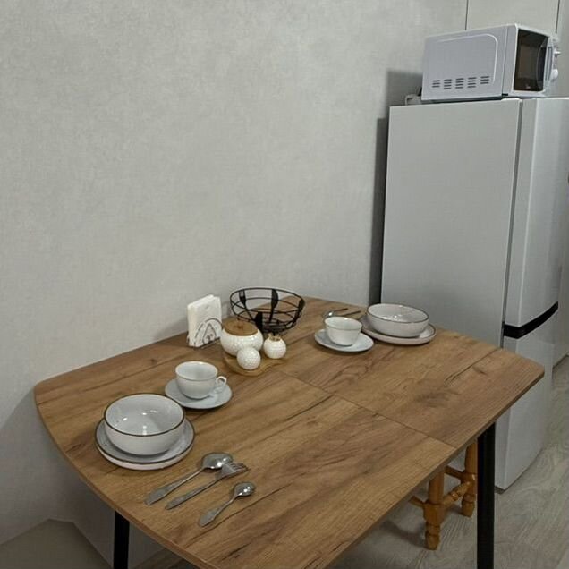 В квартире есть все для комфортного проживания: холодильник, микроволновая печь, чайник, плита, посуда, столовые приборы, телевизор, стиральная машина, пылесос, 2 больших шкафа для хранения вещей, большой и удобный диван, кухонный гарнитур, обеденный стол со стульями, полка-стеллаж, которая визуально делит комнату на две части. При желании в зоне кухни можно поставить еще диван, что создаст еще одно дополнительное место.