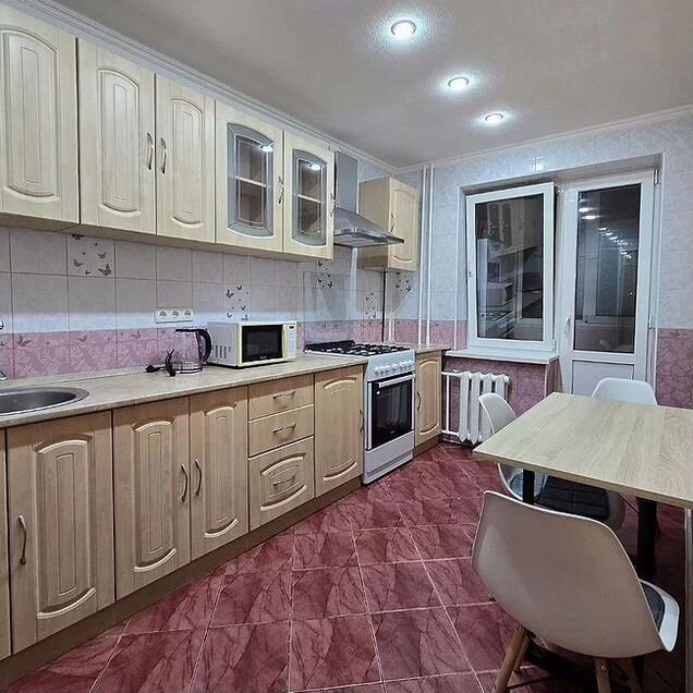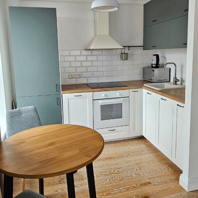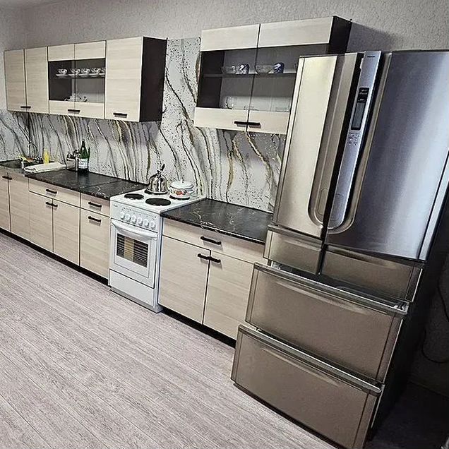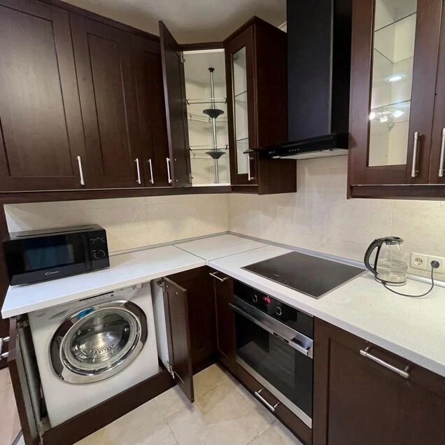 Кухня порадует вас современным гарнитуром, где найдётся место для всей необходимой посуды. Здесь установлен двухкамерный холодильник, микроволновая печь и удобная обеденная зона. Для вашего удобства также предусмотрена стиральная машина.