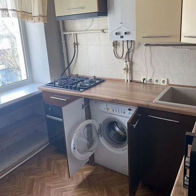 Кухня оборудована стильным гарнитуром со встроенной варочной панелью и духовым шкафом, что делает процесс приготовления пищи максимально комфортным. Современная стиральная машина значительно облегчит бытовые заботы.
