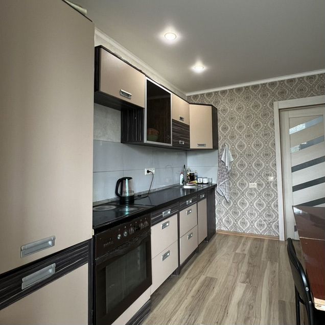 Кухня оснащена современным гарнитуром, где есть всё необходимое: двухкамерный холодильник, удобная обеденная зона. Для удобства жильцов установлена современная стиральная машина.