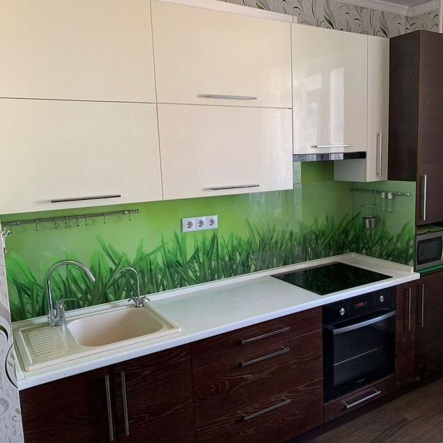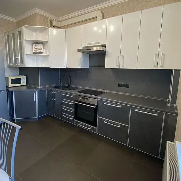 Кухня оборудована стильным гарнитуром, укомплектованным всей необходимой техникой: двухкамерный холодильник, микроволновая печь и удобная обеденная зона создают идеальные условия для приготовления и приёма пищи. На кухне и в коридоре уложена практичная плитка.