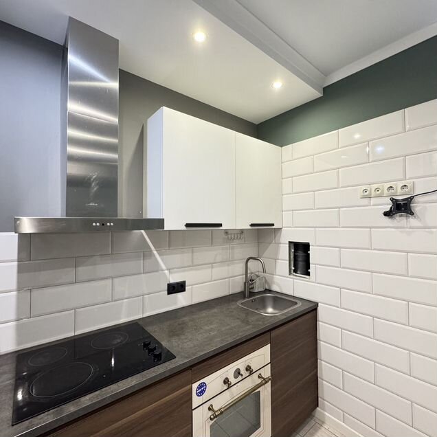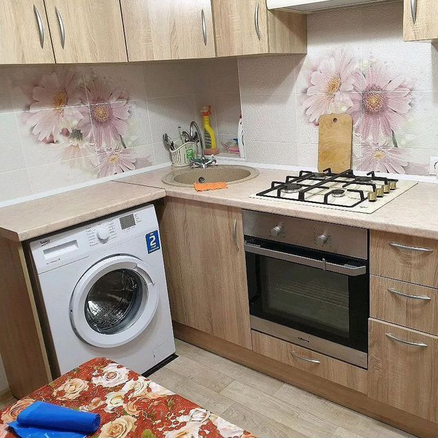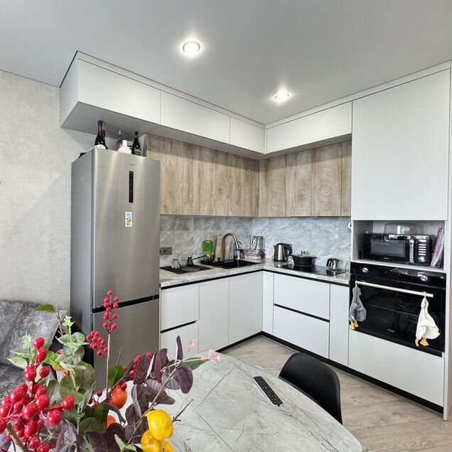 Кухня оборудована современным угловым гарнитуром, который максимально эффективно использует пространство. Здесь установлен вместительный двухкамерный холодильник, создана удобная обеденная зона. Для вашего комфорта также предусмотрена стиральная машина.