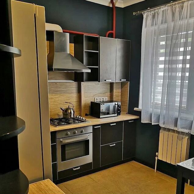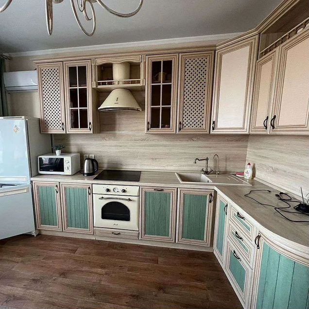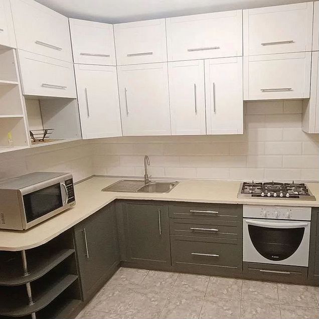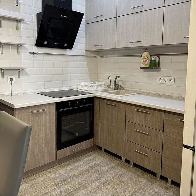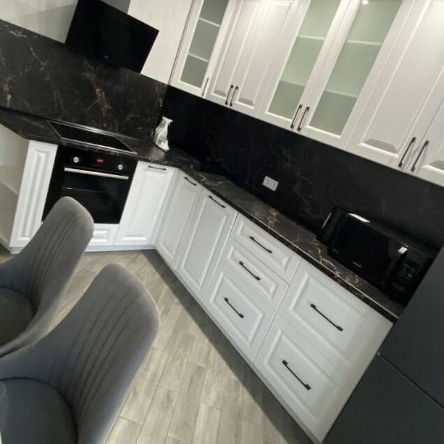 Кухня оборудована стильным угловым гарнитуром, который максимально эффективно использует пространство. В вашем распоряжении — современная бытовая техника: двухкамерный холодильник, микроволновая печь и удобная обеденная зона.