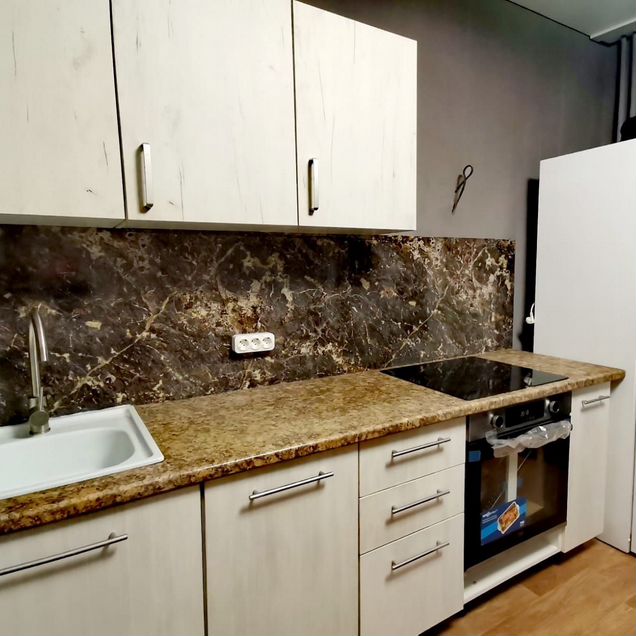 Кухня оборудована всем необходимым: установлен функциональный гарнитур, современная бытовая техника включает двухкамерный холодильник и микроволновую печь. Удобная обеденная зона создаёт атмосферу домашнего уюта.