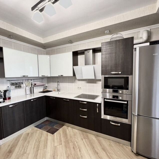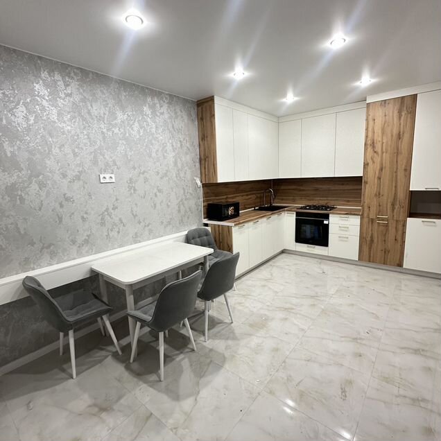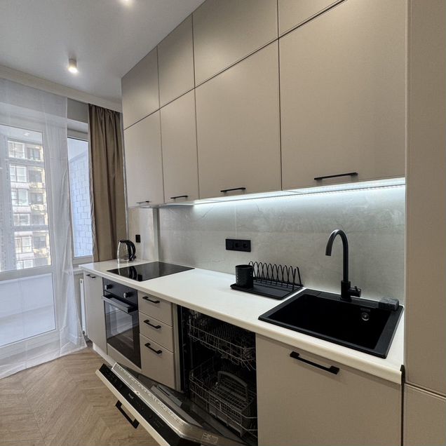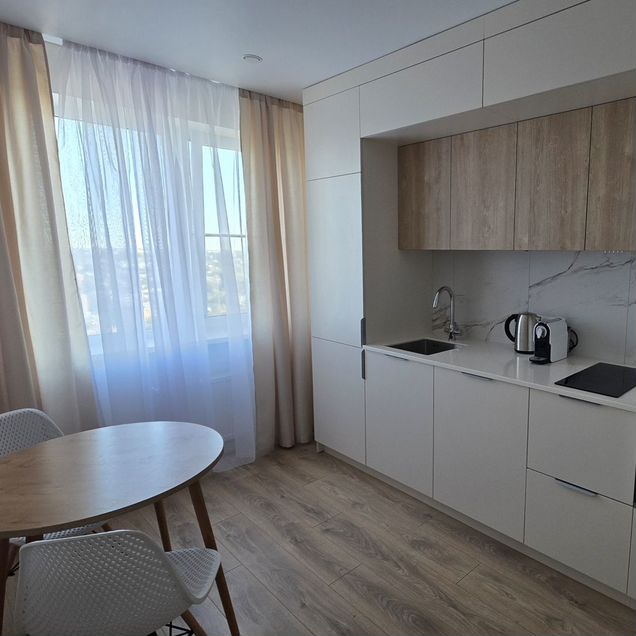 На кухне современный белый гарнитур с встроенной техникой: холодильник, электроплита, вытяжка, микроволновка и духовка. Есть всё необходимое для готовки и обеденная зона. Кухня совмещена с гостиной, где стоит удобный диван, журнальный столик и телевизор. Окна выходят на тихую сторону, так что шума с улицы не слышно. В спальне двуспальная кровать с мягким матрасом, просторный шкаф-купе с зеркалами и тумбочка. Есть место для рабочего стола, если нужно. В ванной комнате современный ремонт: белая ванна, унитаз, раковина с тумбочкой и зеркало. Полы и стены выложены плиткой, всё чистое и аккуратное.