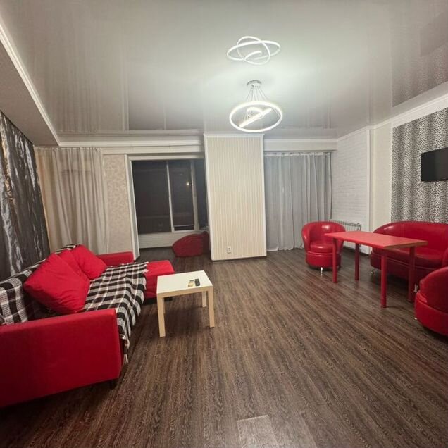 Первая комната впечатляет своей вместительностью и комфортом. Здесь установлен большой угловой раскладной диван, установлен кондиционер для поддержания оптимальной температуры. Пространство дополнено стильным стеллажом, навесной стенкой и вместительным шкафом-купе. Для развлечений предусмотрен современный плазменный телевизор.