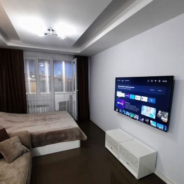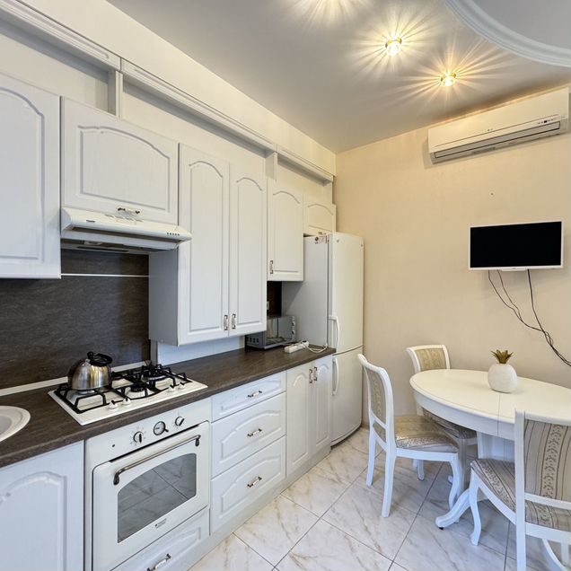 Двуспальная кровать с ортопедическим матрасом, удобный раскладывающийся диван, большой смарт телевизор, кондиционер, уютный балкон, теплые полы в ванной и комнате, wi-fi,
