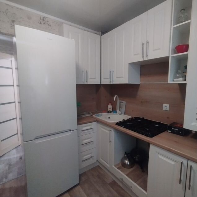 Кухня квадратная, гарнитура нет, есть мойка с тумбой- цена квартиры снижена с учетом этого.