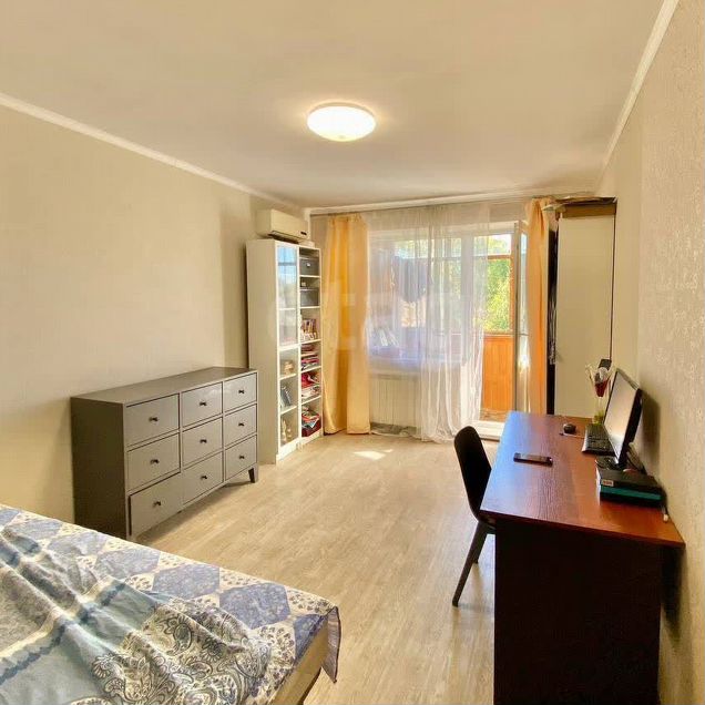Просторная комната оборудована вместительным шкафом-купе, кондиционером, красивой стеклянной дверью на застеклённую лоджию с пластиковым окном и деревянным подоконником. Обширная функциональная кухня готова принять новых хозяев.