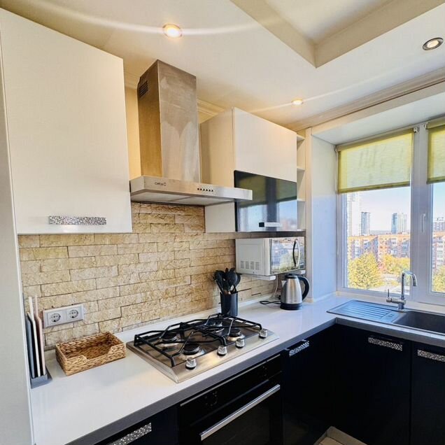 В квартире остается кухонный гарнитур с техникой, шкаф-купе в прихожей, кондиционер, холодильник, диван, светильники, шторы.