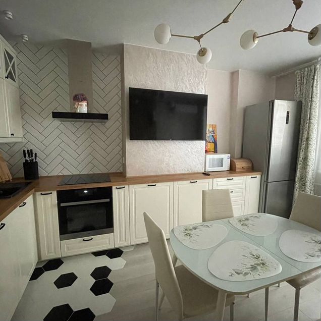 Просторная кухня размером 15 кв.м. На кухне качественная кухня со встроенной техникой