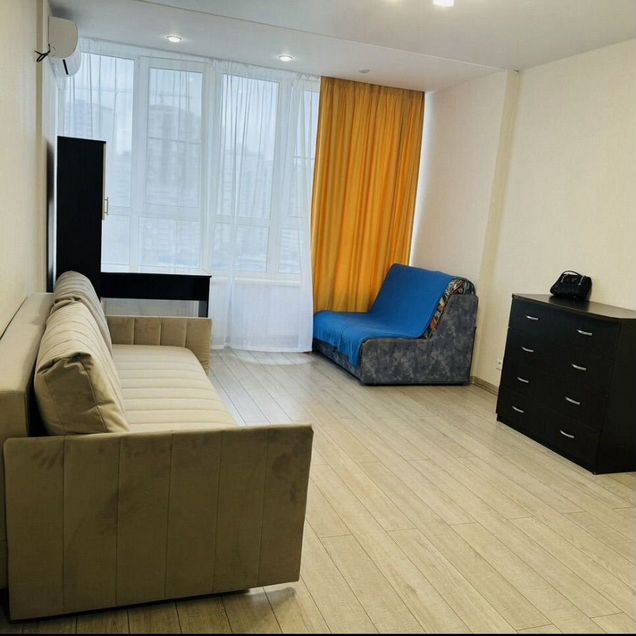 В квартире установлен кондиционер и вся необходимая мебель, включая диван, который может служить дополнительным спальным местом.