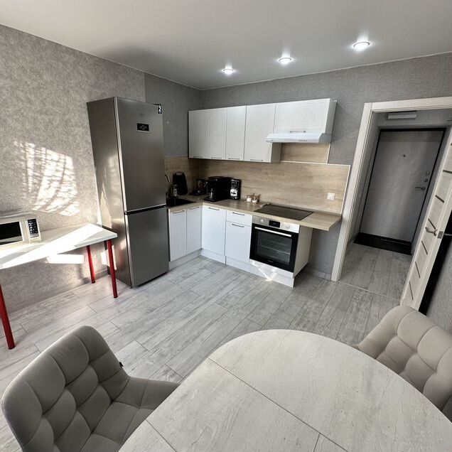 В квартире сделан свежий косметический ремонт. В комнате диван, шкаф, тумба под тв. Новый кухонный гарнитур, новый холодильник, газовая плита и электрический духовой шкаф, стол/стулья, стиральная машина. В коридоре шкаф под одежду.